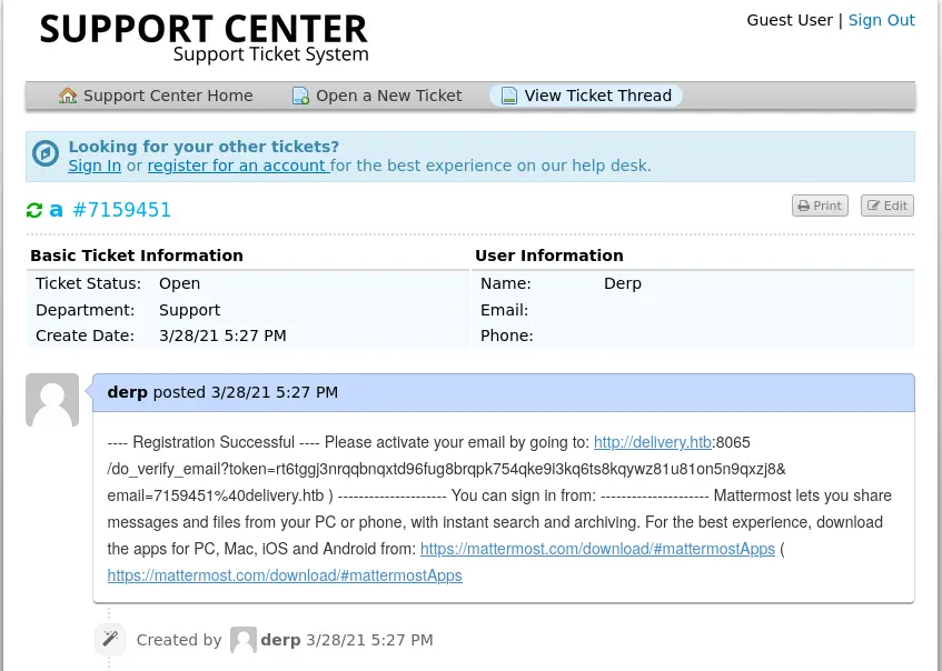 The nmap scan shows an open SSH and HTTP port. On the corresponding website we can find a Helpdesk Application and a Mattermost. To actually access the helpdesk.delivery.htb server, the IP and servername has to be added to /etc/host on the local machine. Mattermost can be accessed over the URL http://:8065. Go to the support center and "Open a new Ticket", upon submit you get an E-Mail Address associated with your ticket 7493836@delivery.htb which can be used to create a valid Mattermost account. The Mattermost activation E-Mails can be retrieved from the delivery support ticket system.