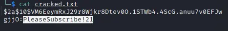 The Hash is a bcrypt and can be cracked with hashcat. To make things easier we used Hob0Rules hashcat -a 0 -m 3200 hash.hash Hob0Rules/wordlists/wordlist.txt -r Hob0Rules/d3adhob0.rule -o cracked.txt -w 3 -O