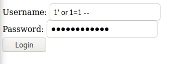 SELECT select_list FROM table_name WHERE username = '1' or 1=1 --' AND password ='1' or 1=1 --'Since we commented out the actual password and username request to the Database, the query test for 1=1 which is always true and grants us access.