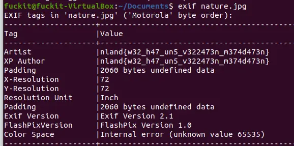 The flag is hidden in the exif tag artist. This can be read using the strings or exif command.
