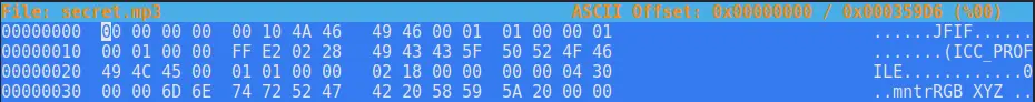 Now we can extract the secret.mp3. It is not a valid mp3. Opening secret.mp3 in a hexeditor we can see that the first bytes are set to zero followed by the hex representation of JFIF.