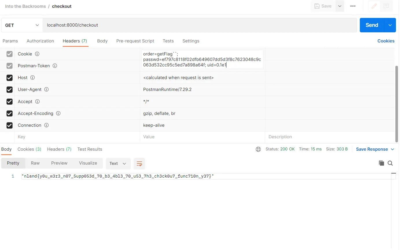getFlag``We need to send a get request to the endpoint /checkout with the cookies uid, passwd and order.