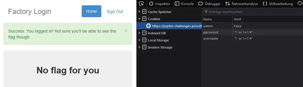 We are supposed to log into the Factory Page with the user Joe. A simple always true injection 1' or 1=1 # gives as access to an internal page, but we can't use it to log on as Joe. Thankfully, the correct login attempt generated some cookies we can abuse.