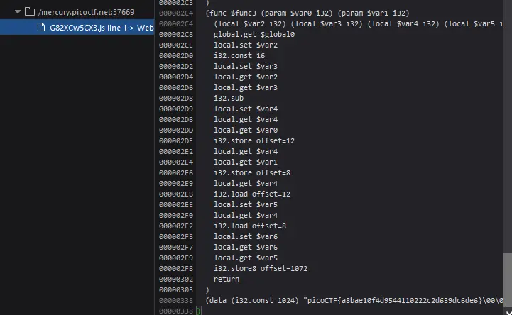 The website has a WebAssembly file that holds the flag at the end picoCTF{a8bae10f4d9544110222c2d639dc6de6}.