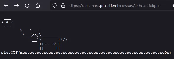 If we take a look at the index.js we can see that a program is executed with the parameter message exec('/usr/games/cowsay ${req.params.message}'. Since exec() works just like a terminal, we can just chain another command at the end. With https://caas.mars.picoctf.net/cowsay/a;ls we can see that the flag is in a file called falg.txt. The command https://caas.mars.picoctf.net/cowsay/a;%20head%20falg.txt prints the file content onto the screen.